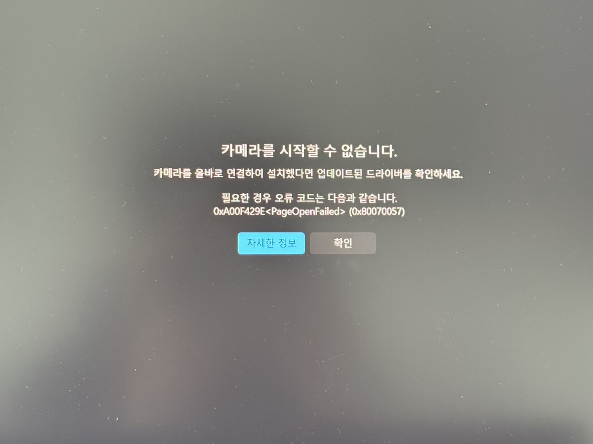 Windows 11에서 카메라 앱을 켜면 웹캠이 동작하면서 카메라 화면이 나와야하지만 위와 같이 카메라를 시작할 수 없습니다. 라면서 카메라가 정상적으로 동작하지 않는다.